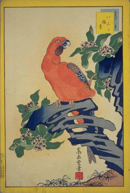 I found this image today, its a woodblock print of a parrot by 嵩岳堂 which I think is read as Sūgakudō from 1859.