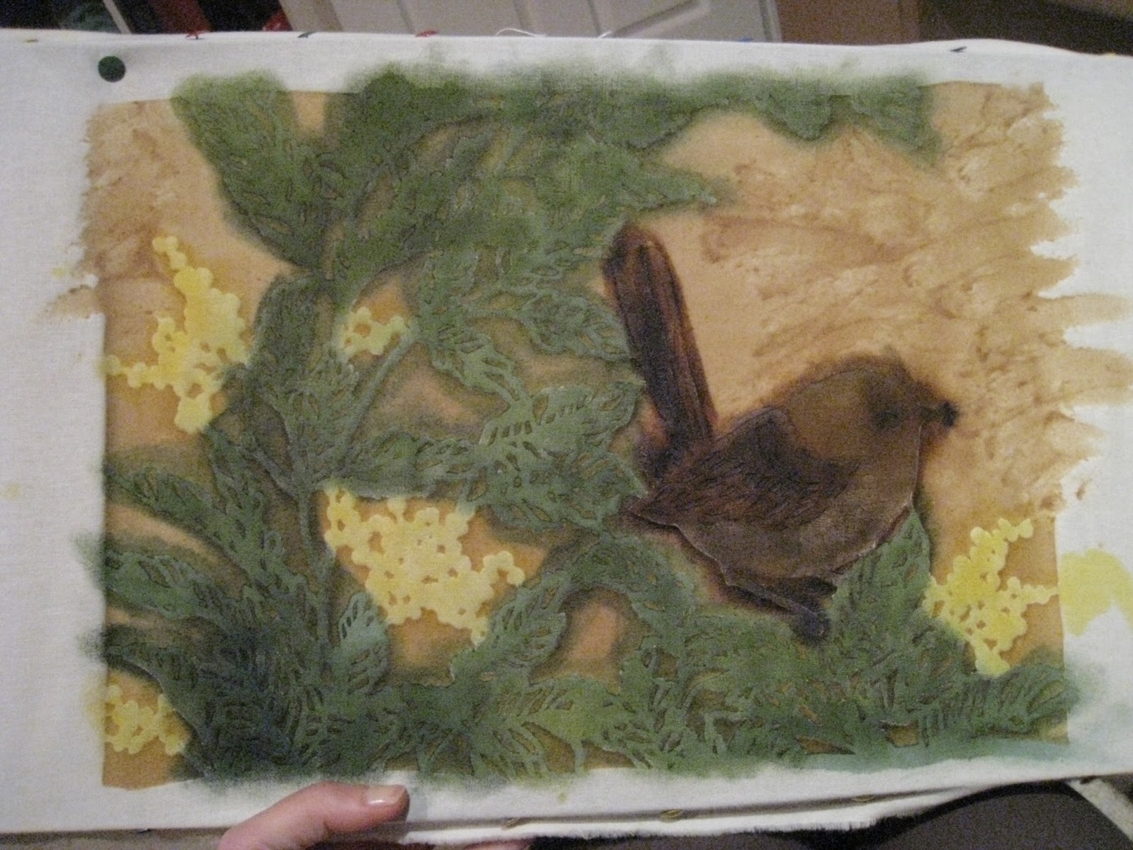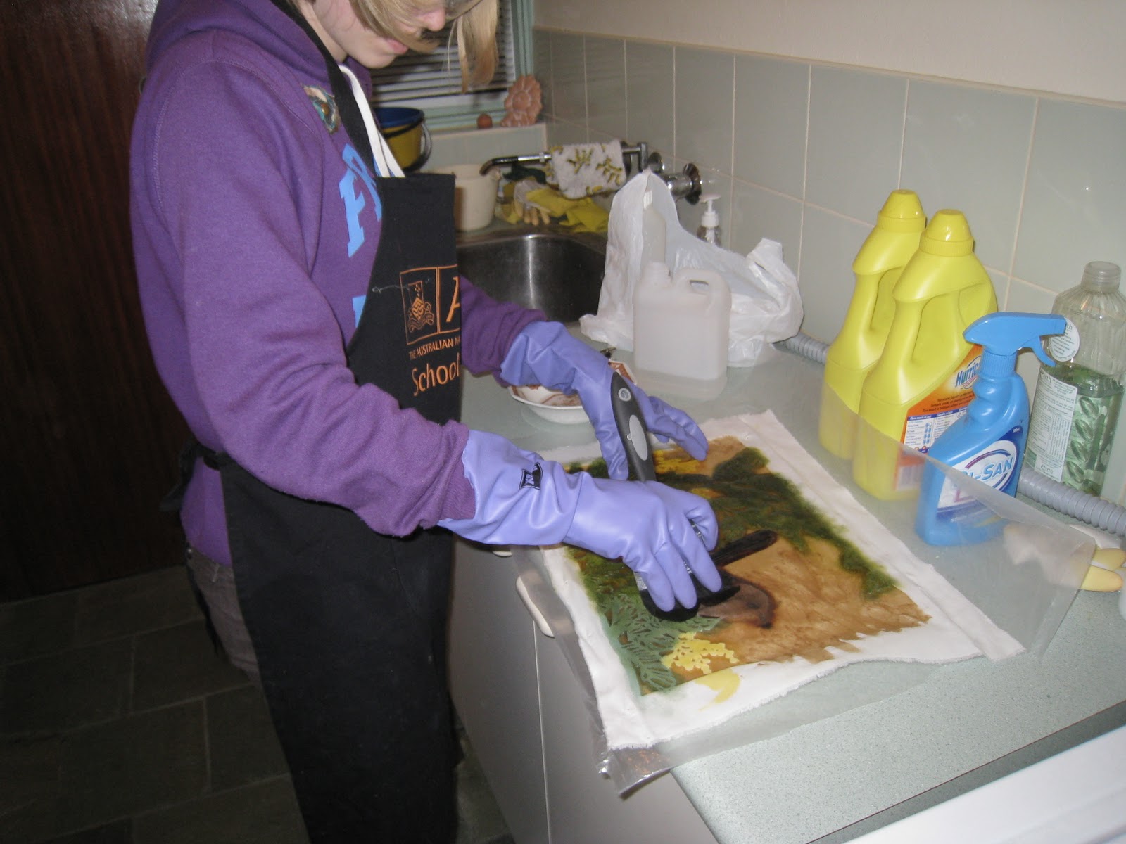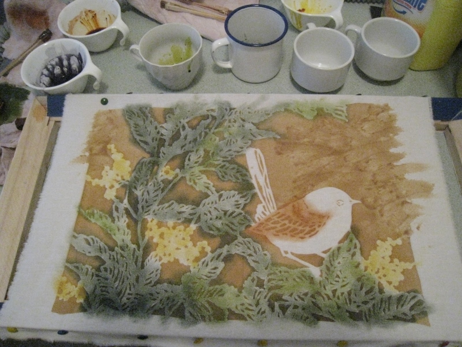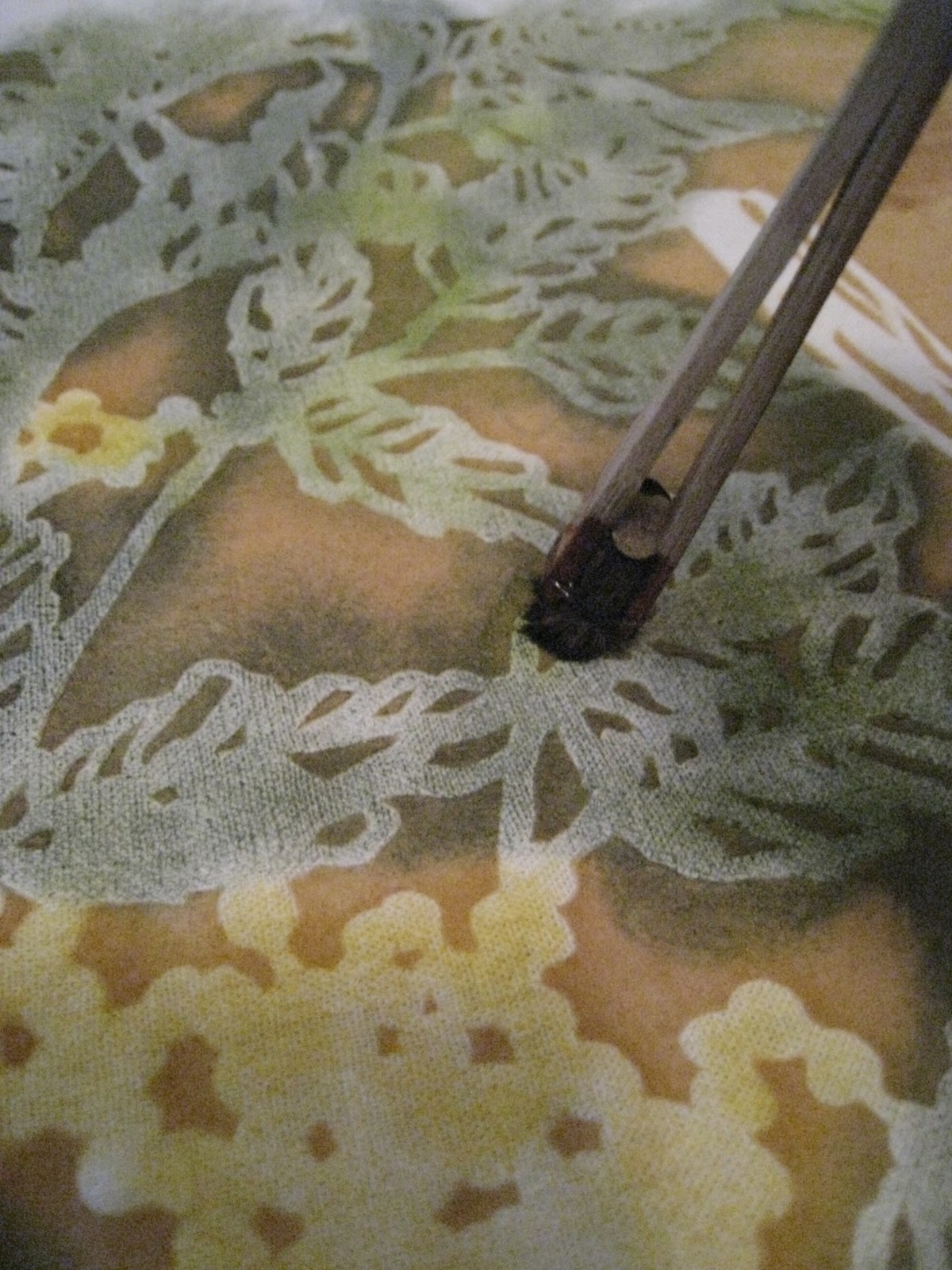 Applying a (nasty) chemical to the front side of the piece to fix the dye to the fabric