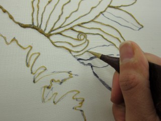 | applying the resist paste with a cone. Gah! its time consuming…but fun somehow |