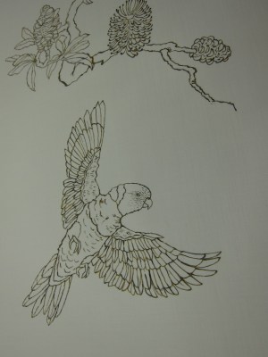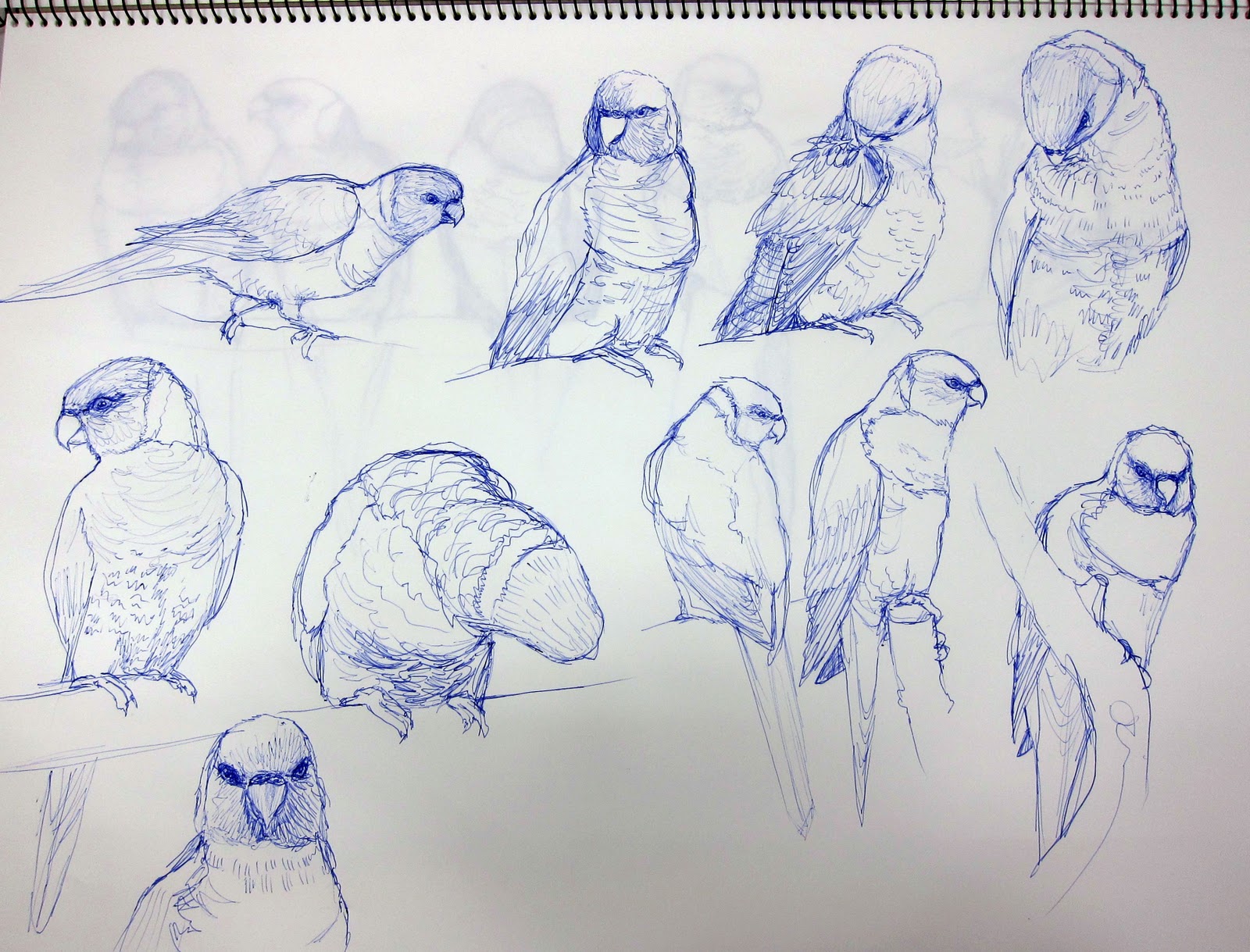 I’ve temporarily put aside the adorable Gang-gang cockatoos to produce a new (larger, eep!) work depicting Rainbow Lorikeets.