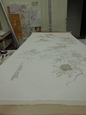 I did a lot of sketching and playing around with the design before starting this piece. Somehow, I always feel like I lose a lot of detail and authenticity when making the transition from sketches to full size work, so I am trying to remedy that this time. Unfortunately, I dont have a picture of the design, as its too big to take a good picture of… But here are some “in-progress” shots.