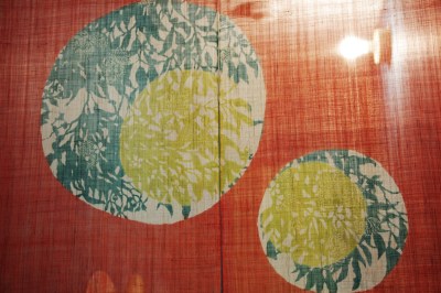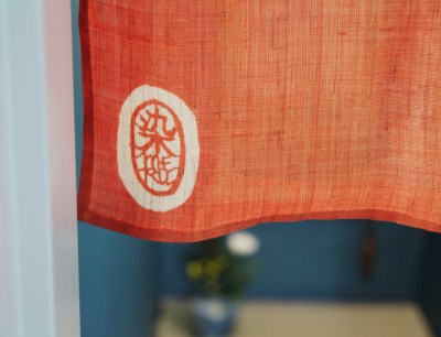 | Noren (split curtain) dyed on linen. I used silhouettes of eucalyptus leaves for this design. 麻で作ったのれん。デザインはユーカリの葉っぱのシルエットです。 |