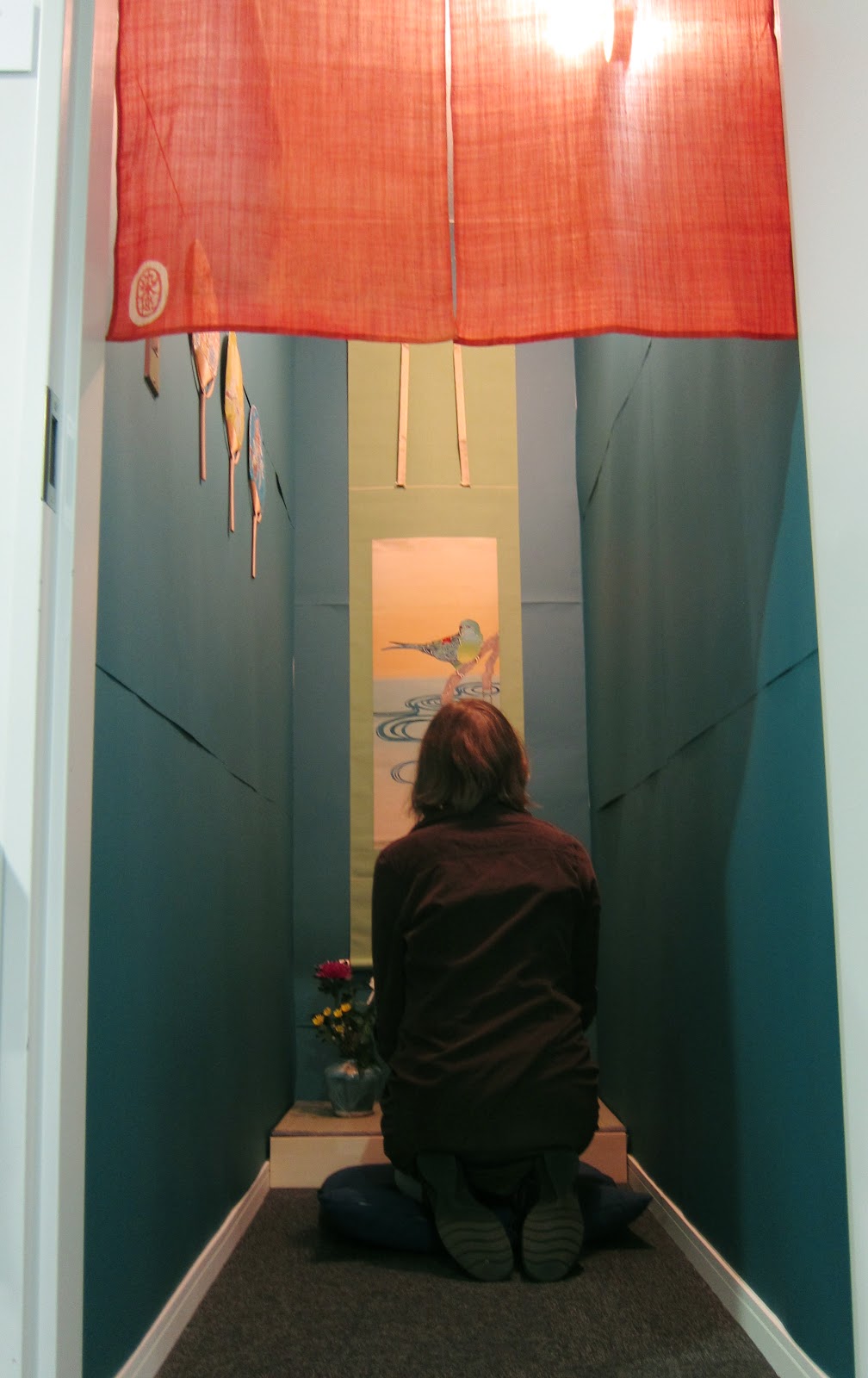 I “wallpapered” the space and built a small raised tatami platform. One of my scrolls hung on the back wall and I arranged some flowers in front too. I was able to display some of the washi paper fans I made last semester on a side wall too. As an entrance to the cupboard and to empashize the tranquility of the space I dyed a noren hanging curtain on linen for the doorway. A zabuton cushion is on the floor in front of the work so that the viewer can sit quietly and enjoy the work.