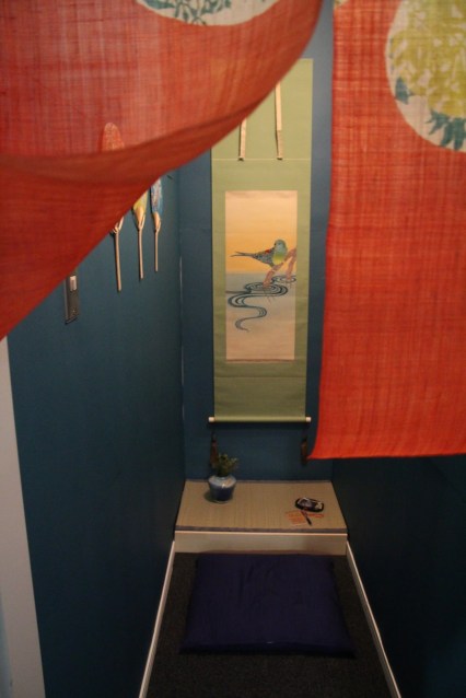 In a traditional Japanese home, one tatami room is reserved for entertaining guests which will have a set-in alcove on one side of the room called the tokonoma. This space is used to display artistic objects for quiet contemplation including hanging scrolls, calligraphy, decorative incense burners and flower arrangements. When observing the items in the tokonoma, you sit in seiza position; on your knees.