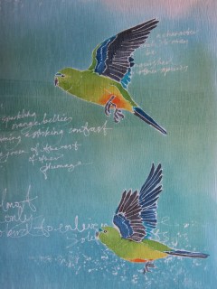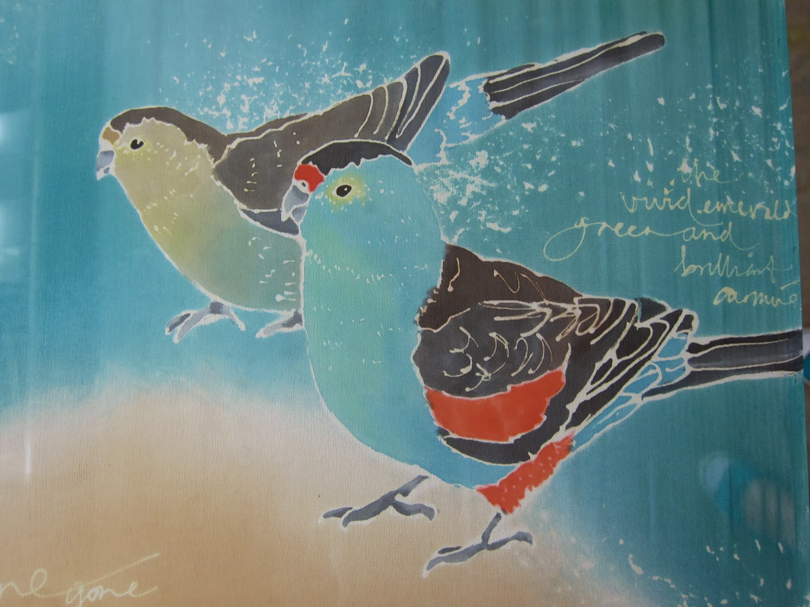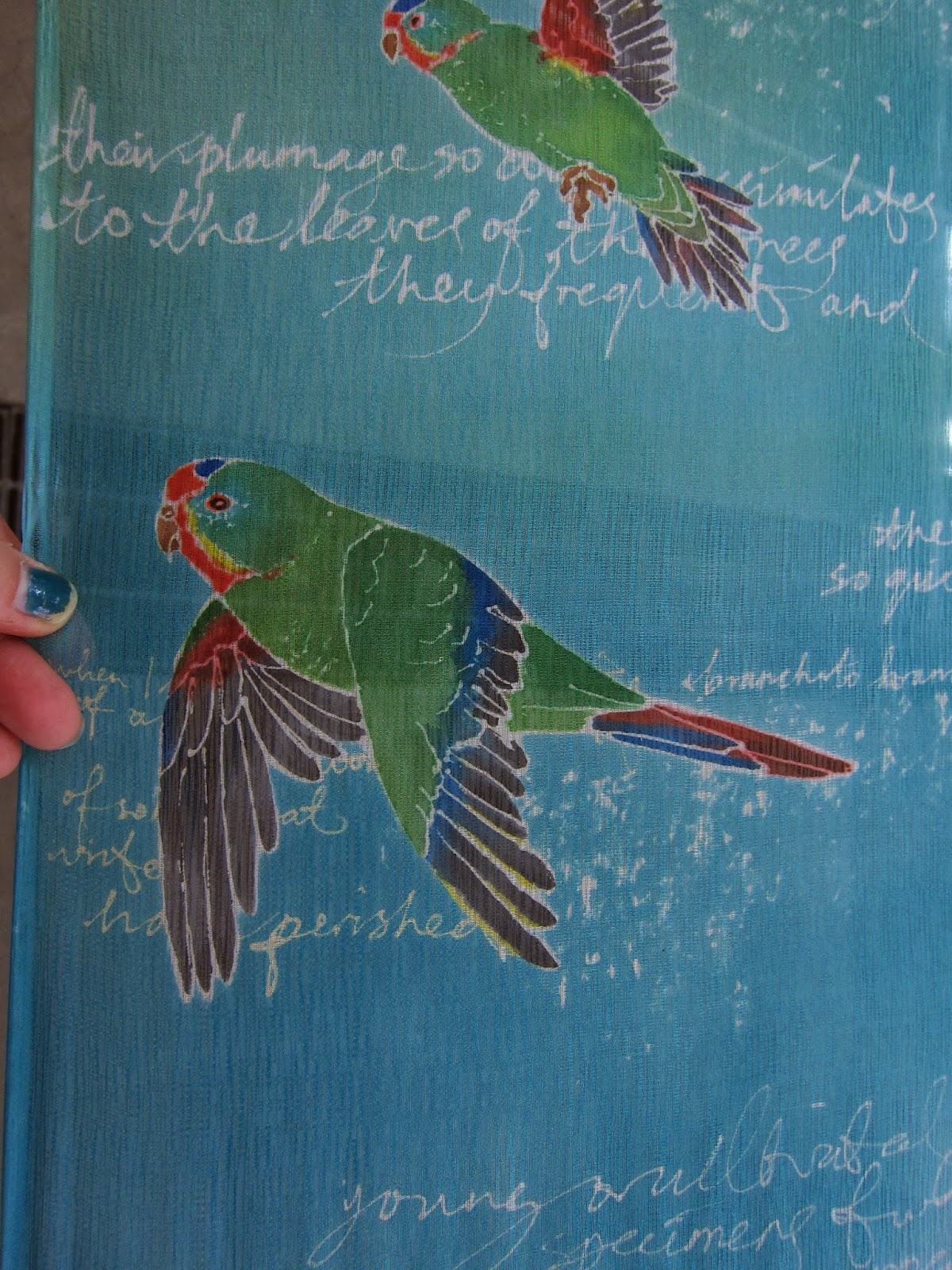 You may be able to see the texture in the work behind the birds? This is fragments of text from writings by ornithologist John Gould (1804-1881). He was an Englishman but spent several years in Australia (mostly in Tasmania) observing and writing about Australian birds. His writings are very descriptive and I love the flowery language he used. The tragic thing is when Gould wrote about these they were still common (well, the Paradise Parrot was already on his way out) but now they are in serious danger of disappearing.