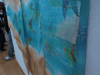 では!展示した新作を紹介します!「Going, going, gone」というタイトルの意味は、「無くなっている、無くなっている、無くなった」のです。右から左へ行くと、描写してある三種類のインコは、オトメインコ(絶滅危惧)、アカハラワカバインコ(絶滅寸前)とゴクラクインコ(絶滅)。つまり、このインコはgoing, going, goneですね。