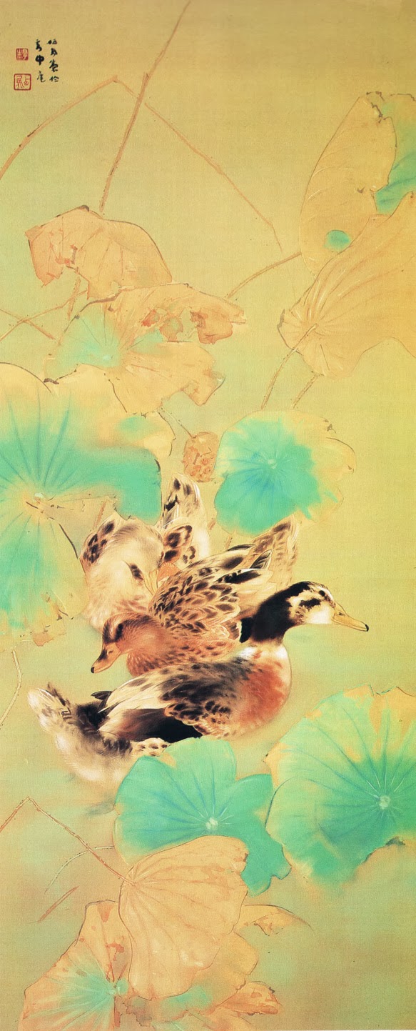 My favourite work in the exhibition was this painting below, 秋興 or “The pleasantness of Autumn” from 1927. For starters, it uses colours very similar to my most recent artwork; this beige and vibrant blue-green. It’s an unusual composition to have the ducks sort of in the centre and then lotus leaves coming in from the bottom and the top, hiding the birds in places.