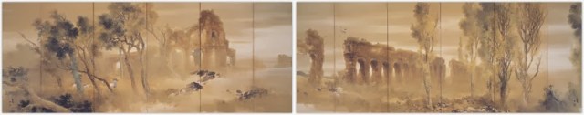 Takeuchi Seiho lived from 1864-1942. In 1900 he travelled to Paris and it’s interesting to see the way this influenced some of his artwork. I thought this pair of paintings was unusual, “Historic Spot of Rome, 1903″ because the sense of perspective and the realistic depiction of space appears very western. Also the subject matter is obviously Roman building ruins whilst the materials and format he used remained very traditionally Japanese.