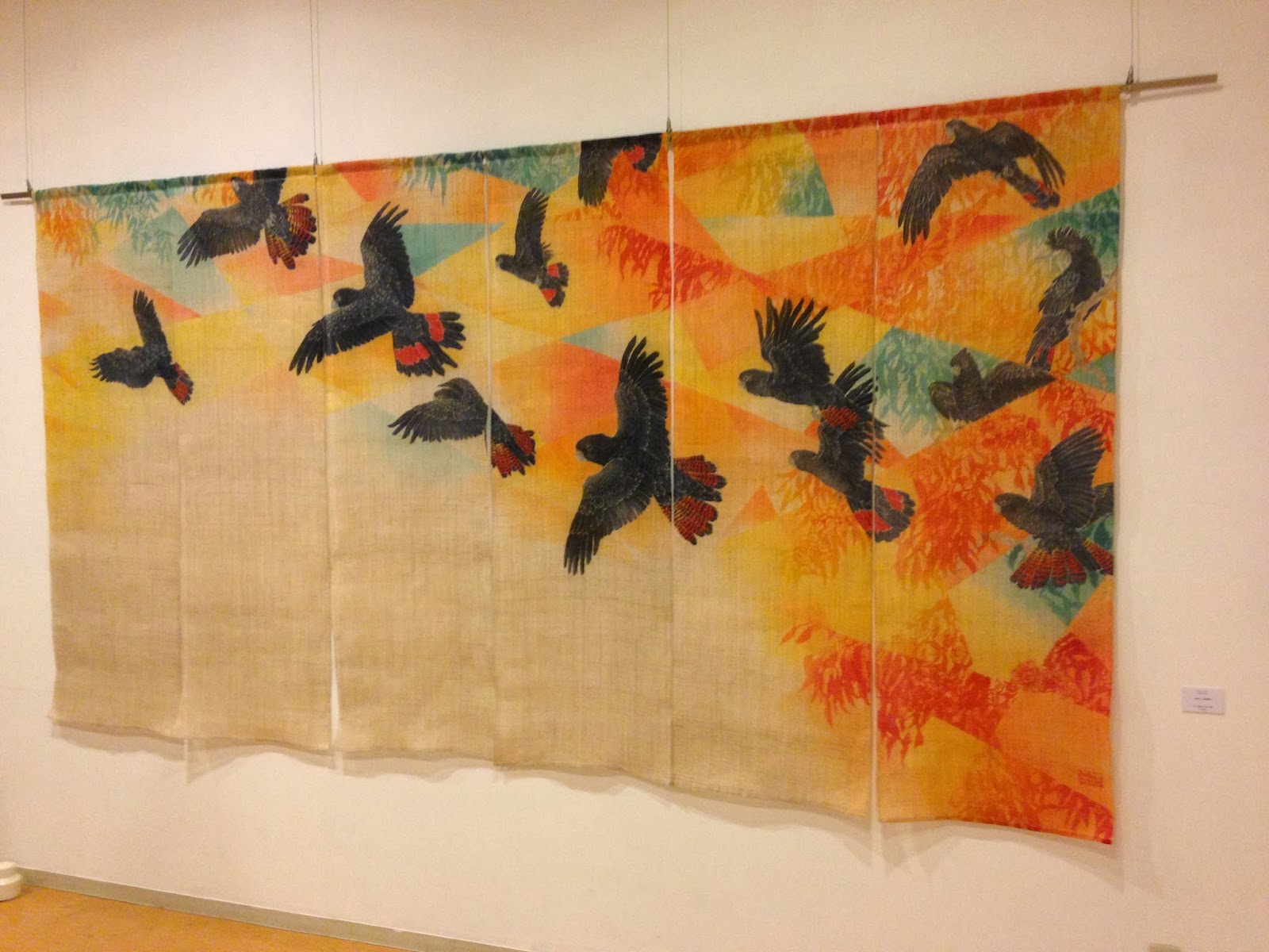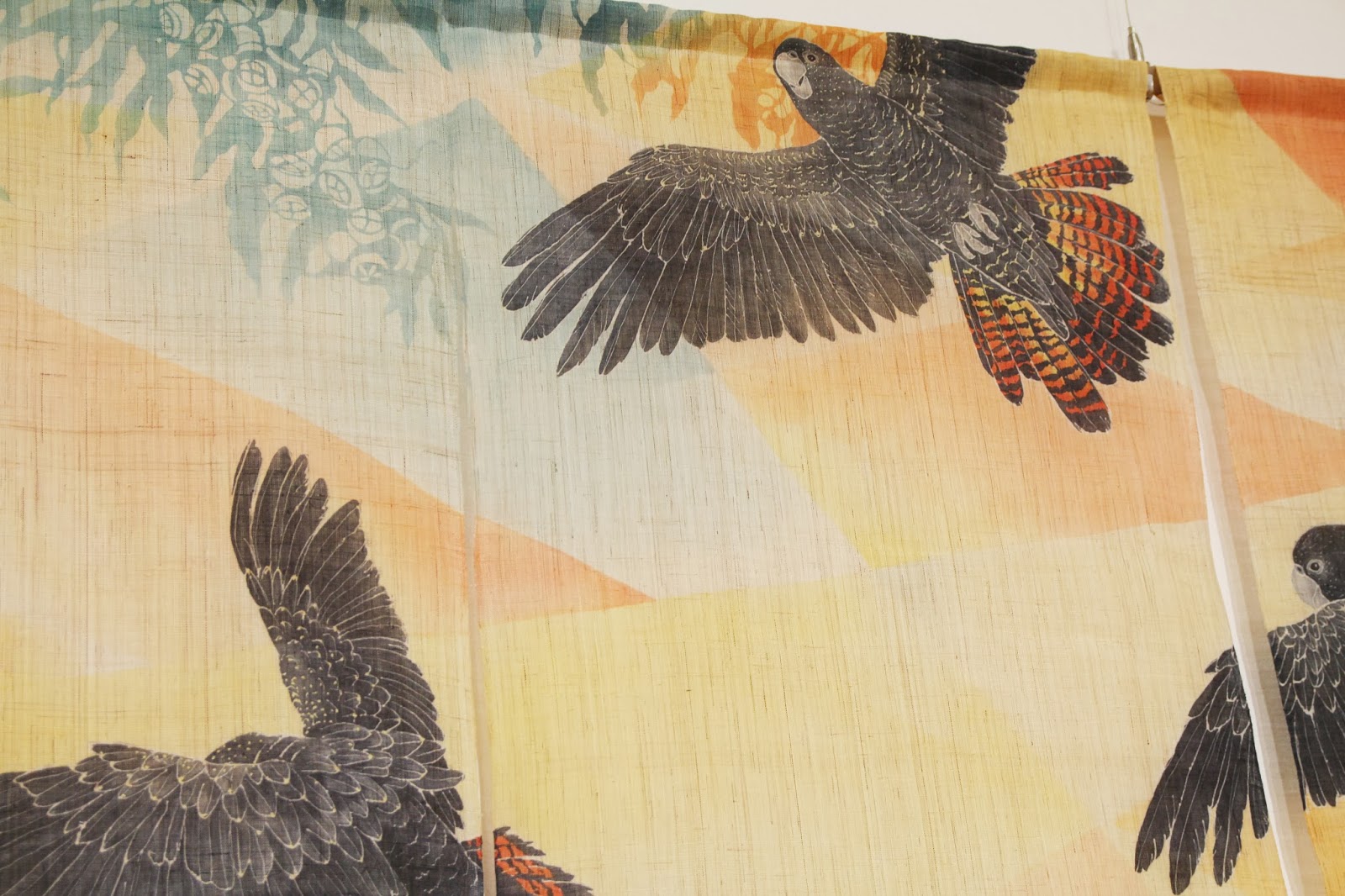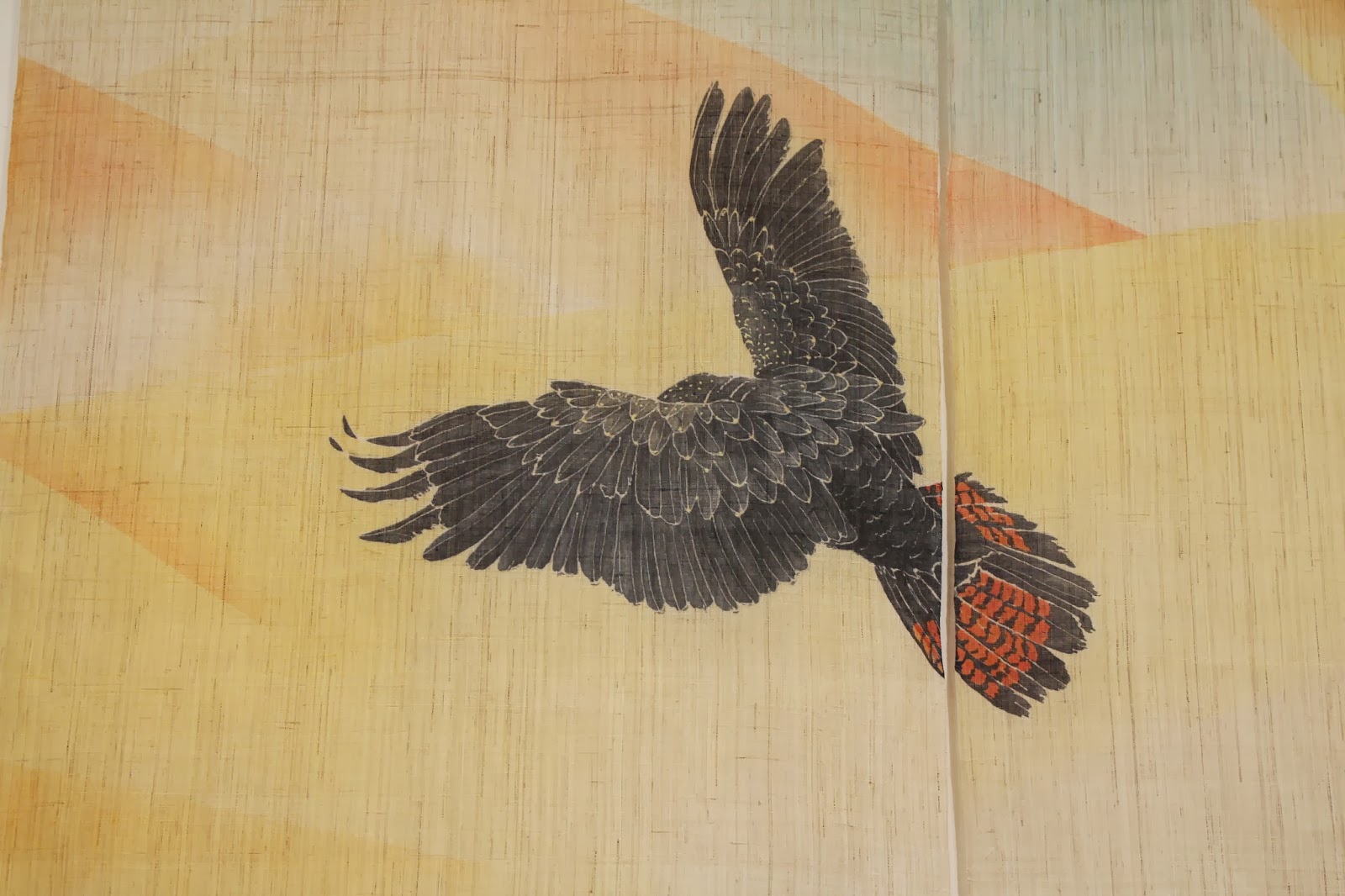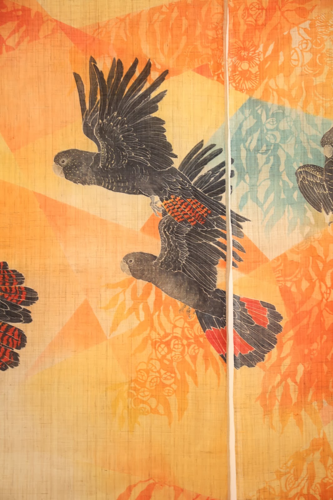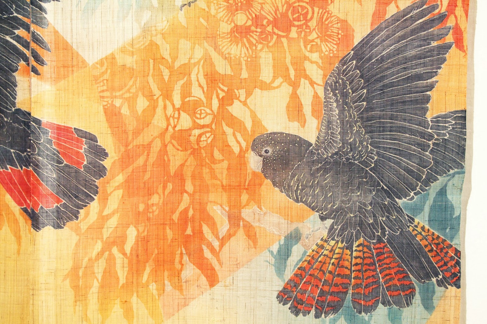 | “Fragmentation: Red-tailed Black Cockatoos” 2014. katazome and yuzen resist techniques on linen. 6 panels of 60x180cm. 「分解化・赤尾黒鸚鵡」 型染、友禅、他。麻地6枚。 |