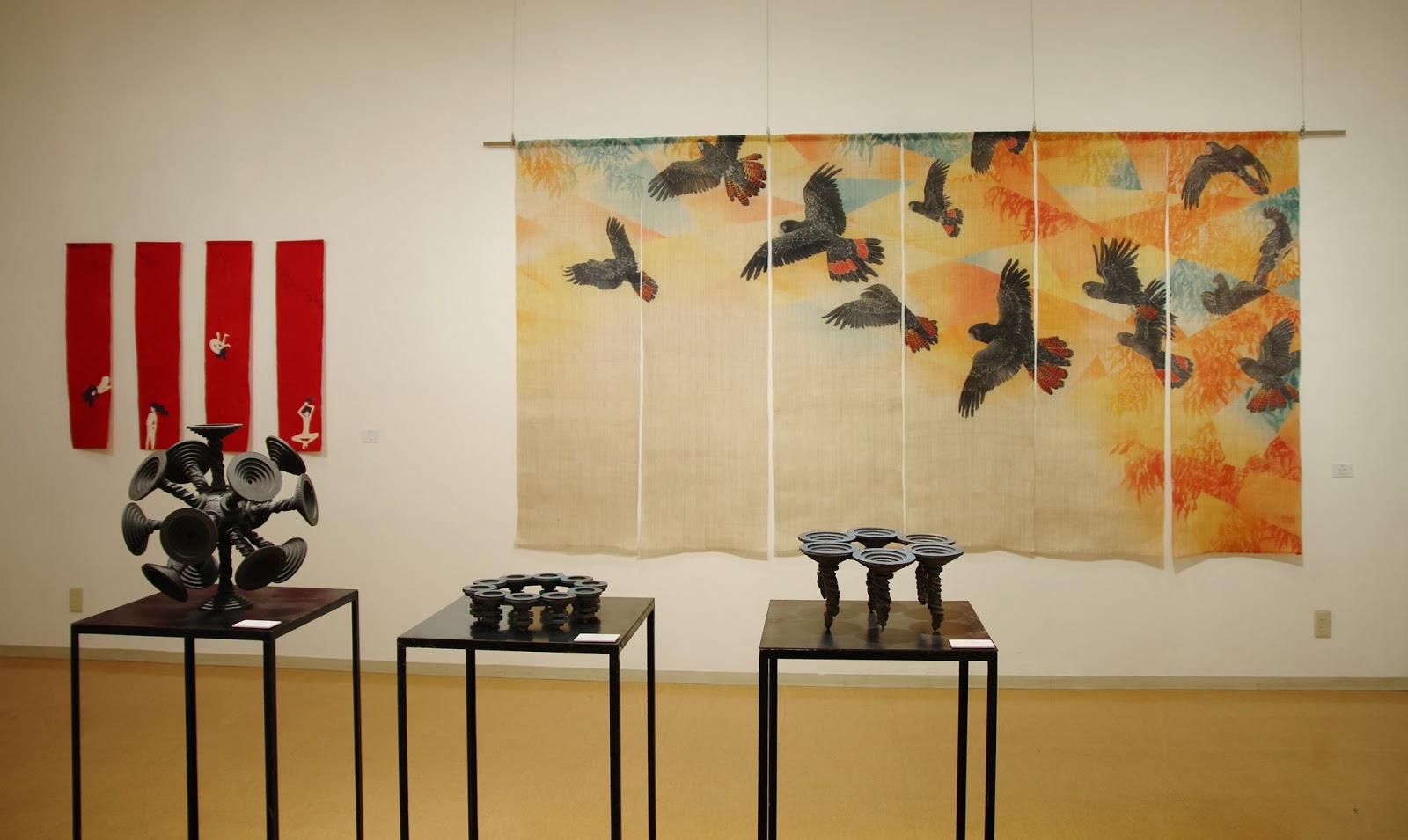 | This work as displayed at the 1st Year’s Masters Exhibition last week. To the left you see the work of my Textiles classmate Kiko Takahashi and in front is the work of Endo Ryotaro. 「大学院1年生展」での展示。左側に同級生の染織専攻高橋紀子の作品です。前景に、陶芸専攻の遠藤良太郎の作品です。 |