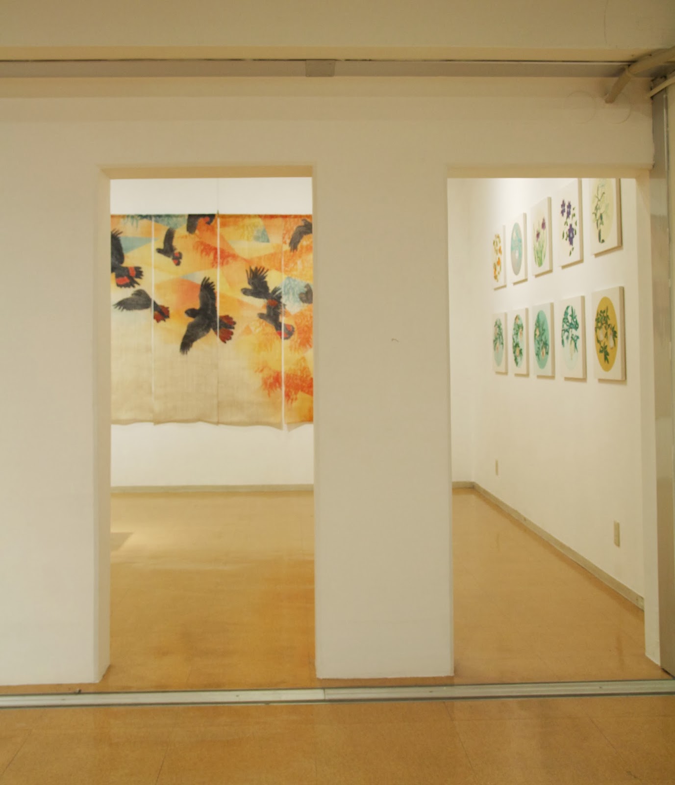 | My work in Gallery Fleur alongside work by 1st year Master in the Japanese Painting Department, Hiroko Kanayama. ギャラリーフロールで日本画専攻の金山ひろこの隣でした。 |