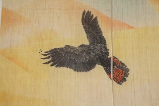技法については、この作品に三つの染め方が混ぜ合わせています。オウムは友禅でそめていて、背景の葉っぱが型染めのもので、幾何学的な背景はマスキングしながら直接染めた所です。