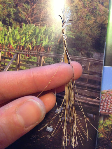-Which is, U-umi or forming the thread. The chingu balls are soaked in water, and split into even finer threads with a knife then the individual lengths (remember the tree trunk is only around a metre long, so the fibres are too) of fibre are knotted together end to end with TINY knots to form skeins of basho yarn.