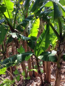 | ito-basho or fibrous banana plants being cultivated in Ogimi. They are grown until the trunks are about 1-1.5 metres tall. 大宜味の芭蕉布会館前の糸芭蕉。 |