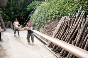 -The woven fabric is again boiled and soaked, pressed under a weight, stretched by hand to it’s correct width, and correct length by a tug of war type effort by two workers.