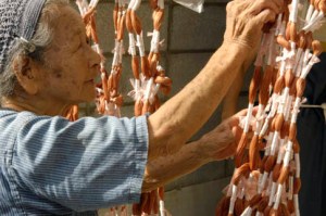 | LIving National Treasure Toshiko Taira dyeing threads that have been selectively tied with tight resists also made of basho. 人間国宝の平良敏子が糸を染めている。白い部分は染料が入らないところですね。イメージは 芭蕉布事業協同組合 からです。 |