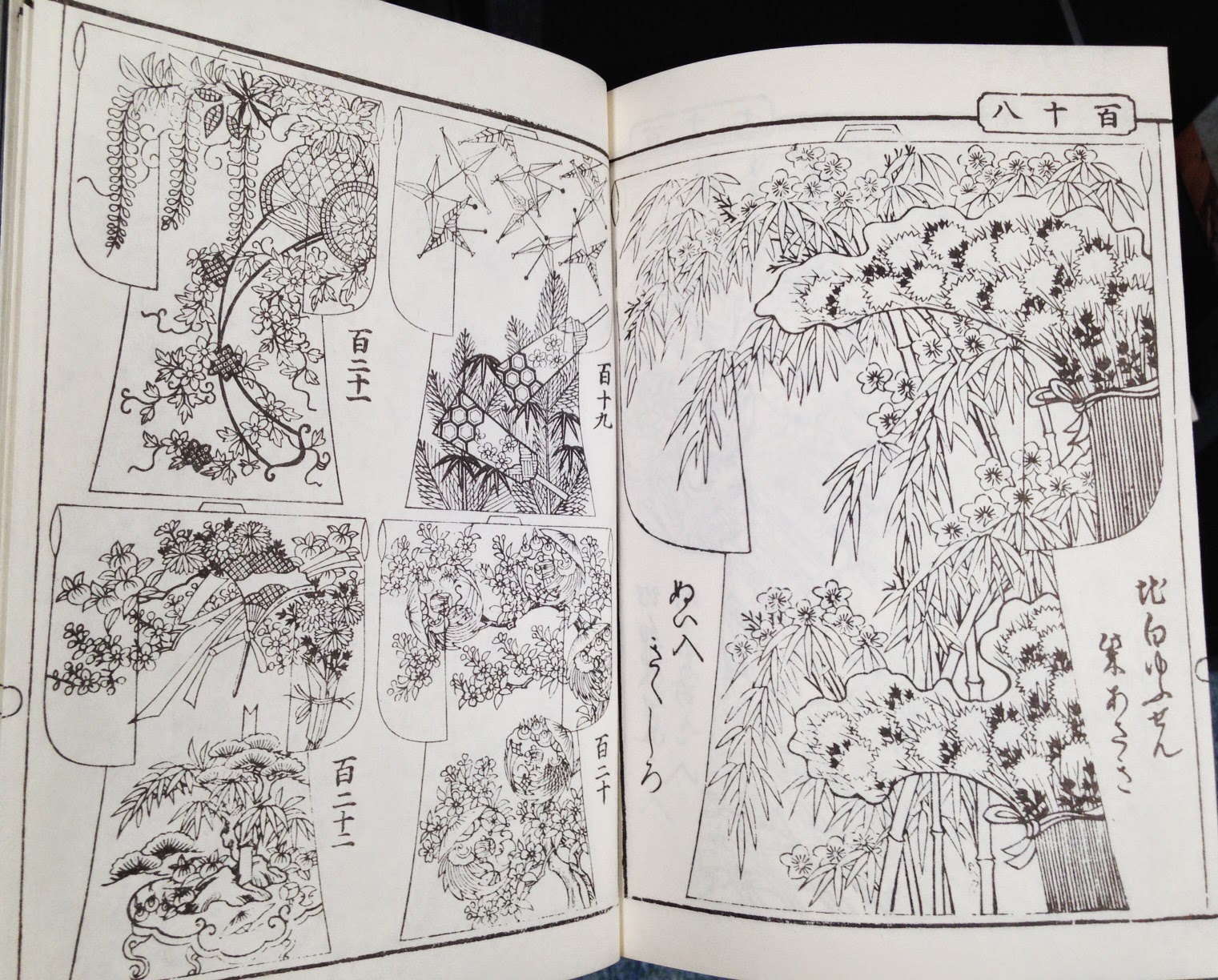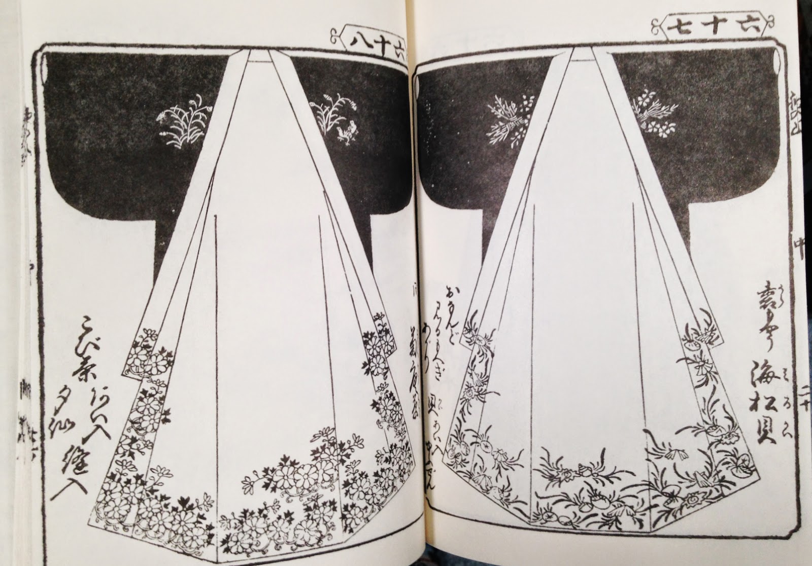 「雛型本」(ひながたぼん)には色んな着物デザインが見えます。雛型は1667年~1820年ごろに刊行されました。「小袖のデザインブック」のような本で、客さんの好み等に合わせて独自の着物が作れたガイドでした。