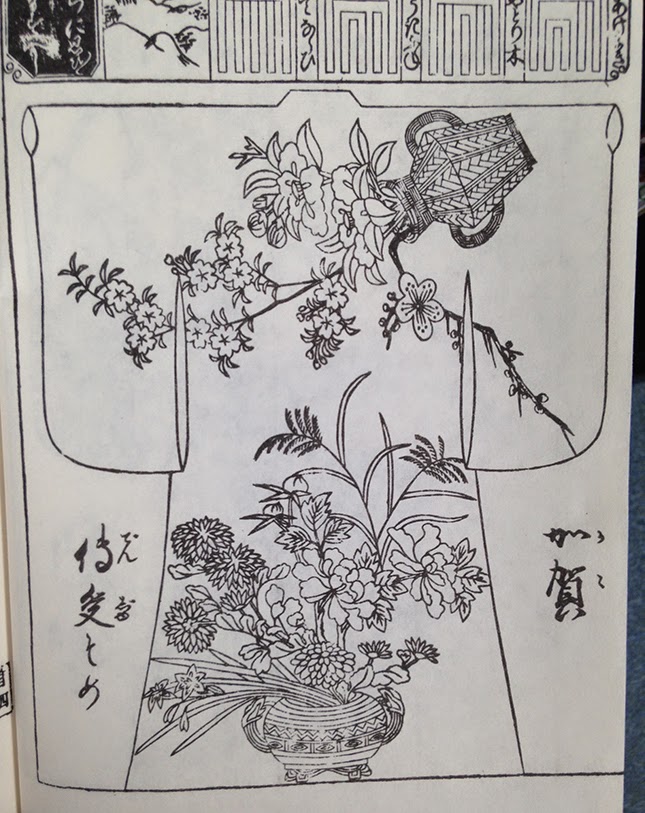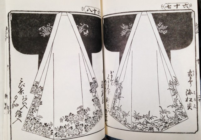 Some great examples can be seen in so-called ‘hinagata’ booklets which flourished around the 1660’s to the 1820’s. They were basically printed catalogues of fashionable kimono designs which were used by dyers and kimono producers as a kind of custom order starting point. The black and white line drawings give a broad design idea which a customer could then have dyed to their size and colour preferences. Some of these would have been pretty interesting if they were actually created. (These books are amazing, I think I’ll have to do another post just on hingata)