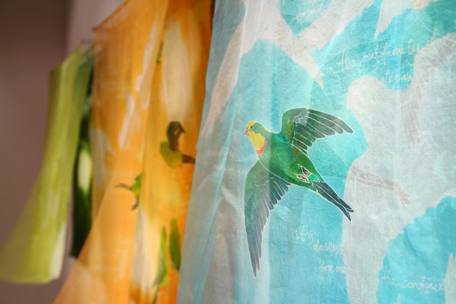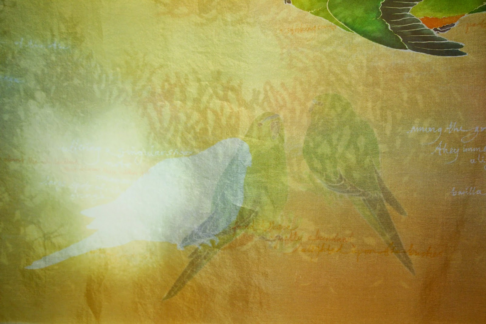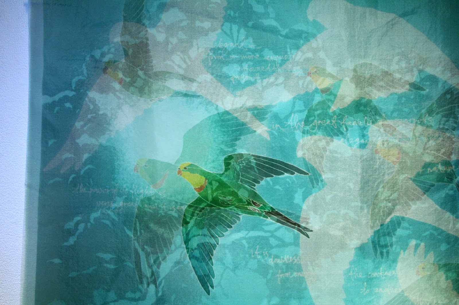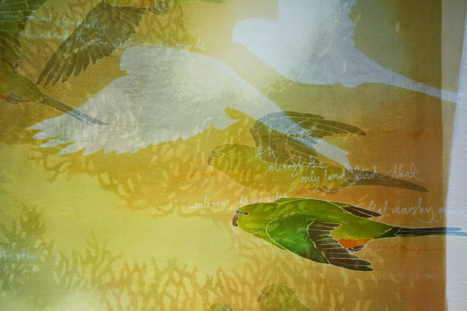| アカハラワカバインコ Orange-bellied Parrots piece. You can see the 3 layers overlapping. The very back is a pattern of coastal heath bushes. |