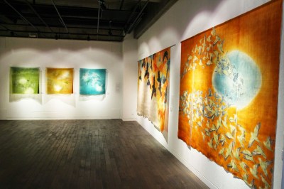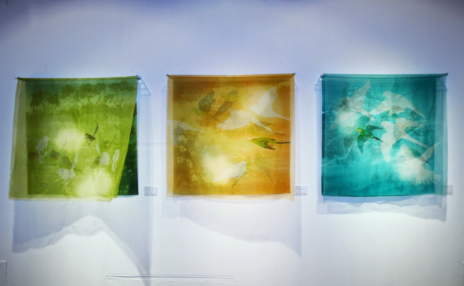 今回は新しいシリーズ一つ、新作一枚と今年1月に染め上げた作品を展示しました。セキセイインコをモチーフにした「Murmurations」という新作を前にここで載せたから、今回は主に新しいシリーズについて説明したいです。