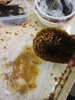 | using a Japanese style scrubbing brush, called a tawashi, to dab nori onto the fabric, a.k.a tataki-nori. 束子でたたき糊を置いた。 |