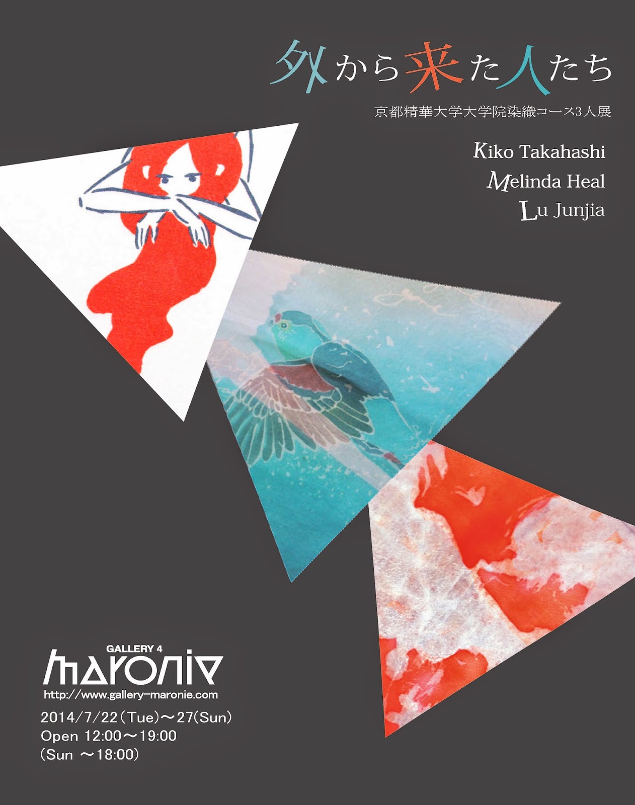 大学院染織コースにいる三人とも京都人じゃないから(北海道、オーストラリア、中国出身です)、それをテーマにして、「外から来た人たち」というタイトルを付けることにしました。