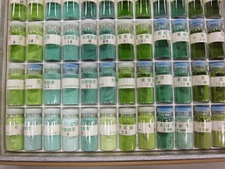 次の種類は「人造岩絵の具」。つまり、鉱物などを化学的に変化させたものです。色は天然岩絵の具より多彩です。先生の話によると、明治時代に油絵が日本へ入って来たとき、日本画家は油絵の色や強さに印象を受けました。それで、同じような強さを表現したかったから色数を増やして欲しかったらしいです。色が並んでいるとすごい綺麗ですね!色名も面白かったです。「鶯」、「あづき」、「裏葉緑青」というような名前を読んだら、どういう色かはすぐに頭に浮かびますね。