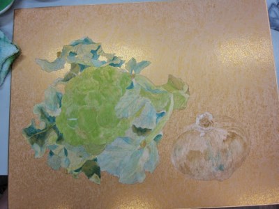 彩色してから金箔っぽいのパネルに移しました。パネルがつるつるだったから、一回胡粉(白い粉)を野菜のところだけに塗りました。それでやっと絵の具の楽しい段階へ行きました。