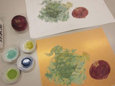 講座の目標は日本画に独特な岩絵の具を体験することだったから簡単な主題として野菜を描かせました。私は丸くて面白いブロッコリーと綺麗な紫のレッドオニオンを選びました。