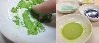 | getting into it, mixing pigments with “nikawa” 膠で溶けた新岩絵の具 |