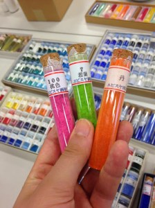 And next down the rungs in the nihonga pigment hierachy are the ones we were actually allowed to go nuts with, suihi enogu. These are what beginners usually start with and are also used for underpainting (shitanuri). Some of these were quite beautiful and others were just…argh! They reminded me of some of the really acrid chemical dye colours in textiles, especially the horrible yellows and pinks. Which makes sense because the cheap nasty ones like these are just go-fun chalk white that has been chemically DYED! Apparently students are advised not to use these because they tend to bleed and stain if used in the underpainting!