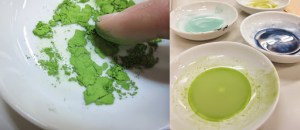 To actually apply the powdered pigments to your painting surface, they are mixed by hand with an extracted animal collagen called nikawa. This mostly clear liquid is a little thick (depending on individual preference) and it’s got a bit of an animal smell, though not overwhelming. Using your finger you work the powder into a smooth liquid with an appropriate amount of nikawa.