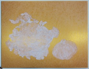 | Gold panel with a base coat of go-fun chalk painted on. 胡粉を野菜のところに塗った後 |