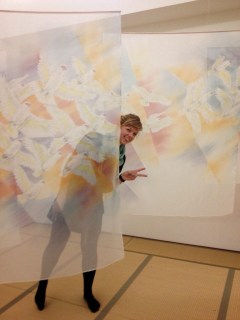 | Sneaking a photo amongst my own work at Some-seiryukan Gallery in Kyoto, November 2014. 自分の作品に入って写真を取っちゃった。去年の11月、京都の染・清流館で。 |