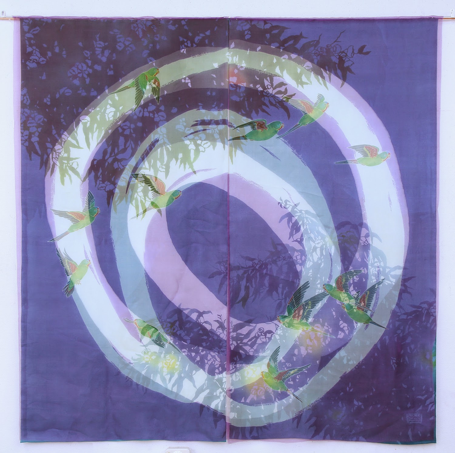What I mean is, a room or even better a semi-outdoor space full of hanging dyed fabric, that you walk through, look at, which moves as you walk by and shows off the best of Australia’s brilliantly coloured scenery or birds. And it would be something you are free to touch.