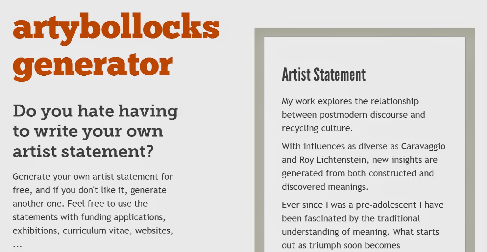 | An old favourite, http://www.artybollocks.com/ which generates random artist statements and shows you just how meaningless they really are |