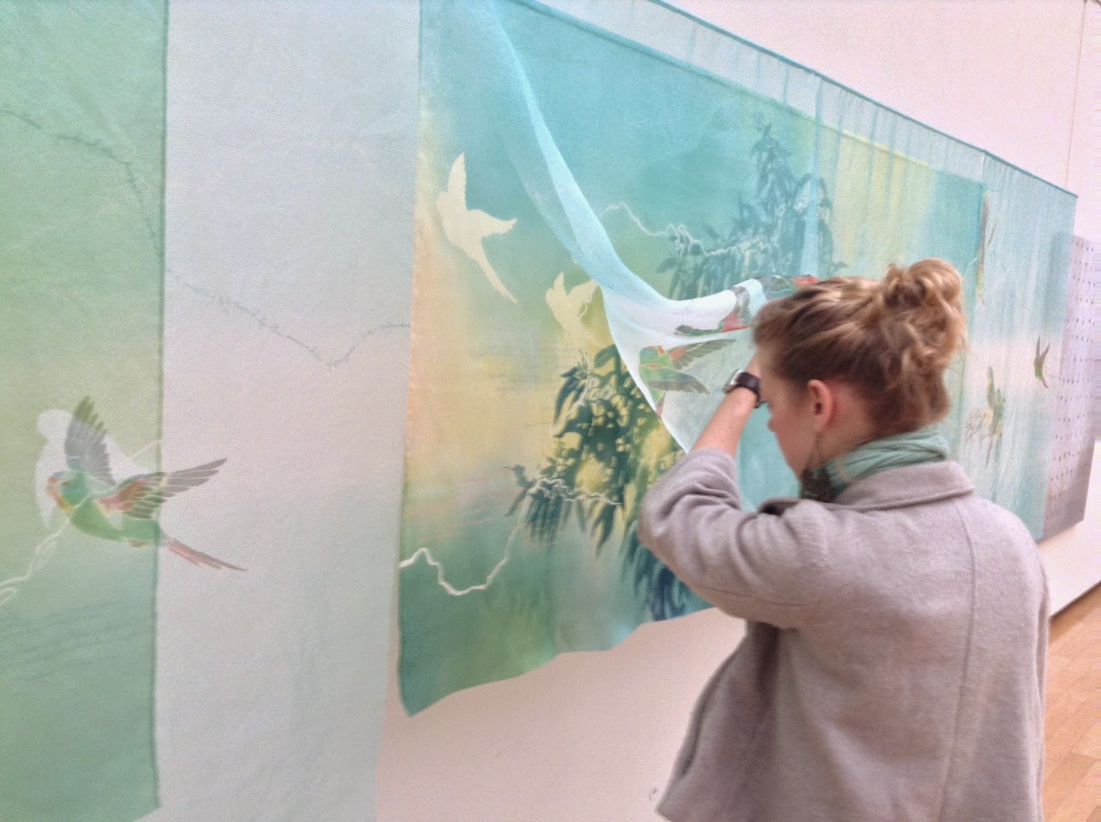 | Sneaking a photo amongst my own work at Some-seiryukan Gallery in Kyoto, November 2014. 自分の作品に入って写真を取っちゃった。去年の11月、京都の染・清流館で。 |
