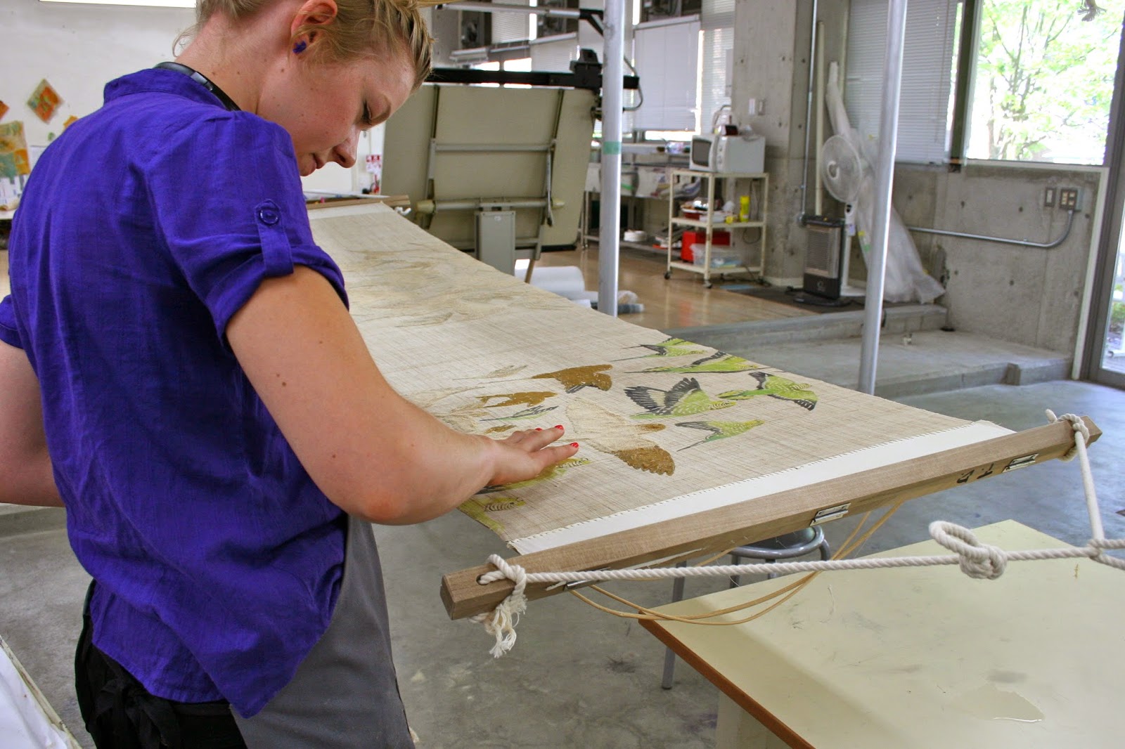 例えば、モールの天上から草木染の生地の作品を吊り下げる?カフェの壁に鳥と鳥類者の文章が染めてある作品を展示する?大きな半透明の作品を事務室の間仕切りに使ってもらう?病院の接客室に掛ける?国立公園のビジターセンターに展示する?