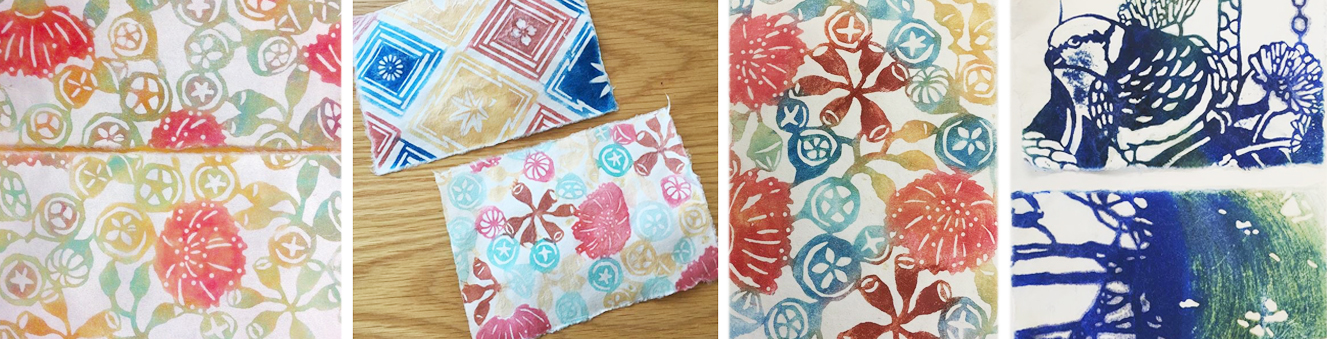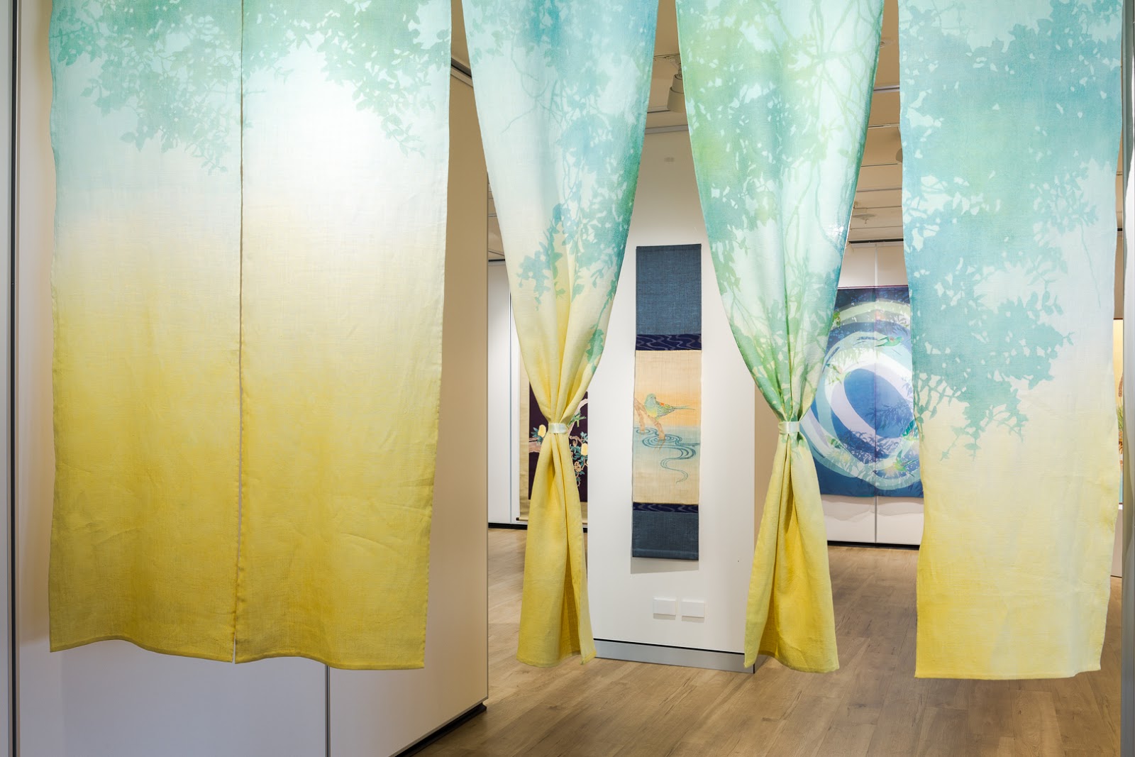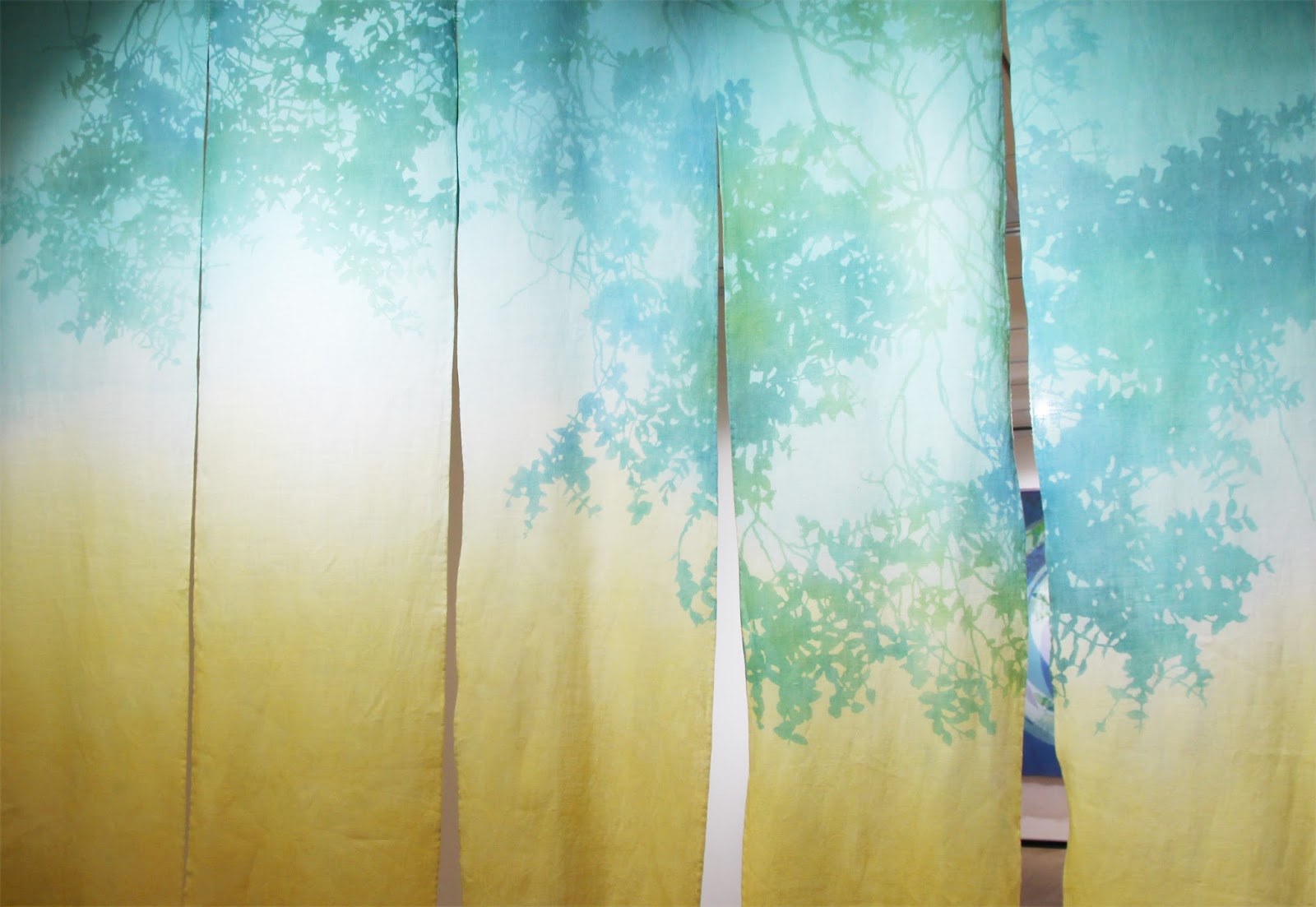 I called the noren “A Hearty Welcome”, referencing its function as a gateway to the exhibition. I dyed it using katazome on hemp fabric which I sourced in Australia. Previously I’d dyed several noren but on Japanese linens which have a certain stiff feel to them and are rather open weaves so that a glimmer of the space behind the curtain is also visible. I’m yet to find a fabric with similar qualities in Australia but the hemp fabric was a new experiment using a natural looking slubby cellulose fibre. It’s a little softer than I would like, as it creases easily and softens in the washing stage of katazome.
