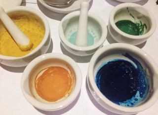 | Mixing commercial pigments with soymilk to a painty consistency. |