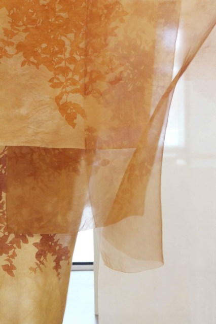 | Floaty detail of Cinerea Breeze. The foliage is dyed using pigments and the background beige and orange tones were dyed in a natural dye bath of Eucalyptus Cinerea leaves. |