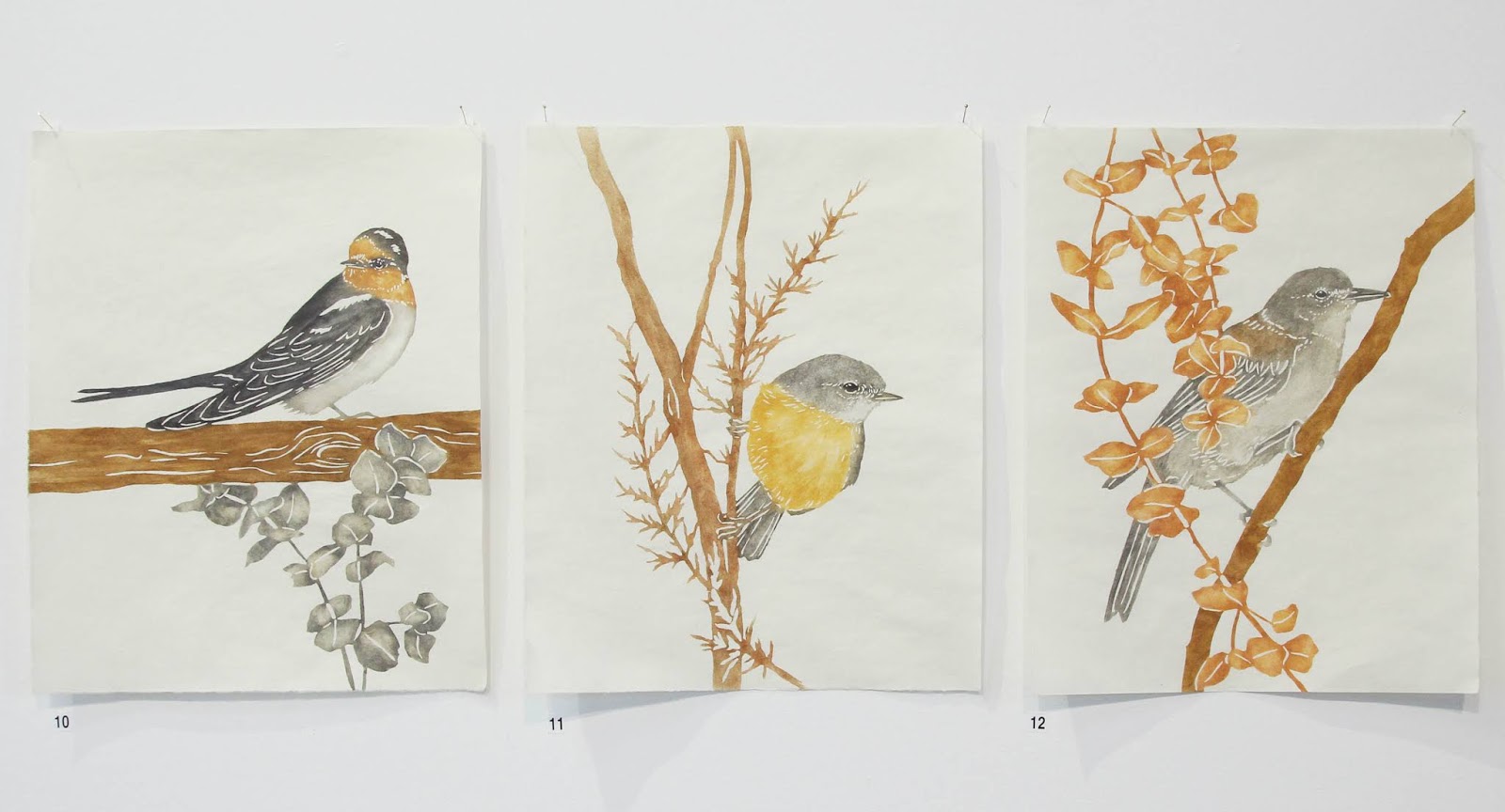 | Left to Right, ‘Welcome Swallow’, ‘Eastern Yellow Robin’ & ‘Grey Shrike-thrush’ 2018. Katazome on washi using local pigments. each 25 x 31cm |