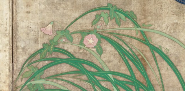 | A Favourite – Morning Glories by Suzuki Kiitsu. Part of a pair of 6panel folding screens. |