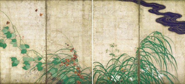 The right hand side alludes to summer – a river, blooming lilies, twining bindweed and long green grasses. The left side is an autumn image of windswept grass, kuzu vine, and other symbolic autumn flowers.